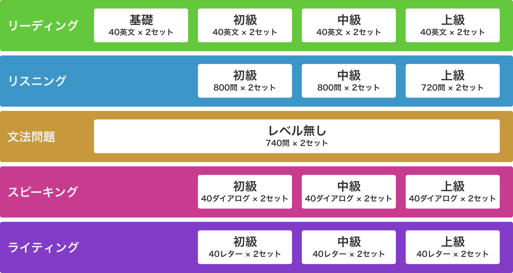 以下の5教材をご用意しており、教材及びレベルを自由に組み合わせてご使用いただきます。