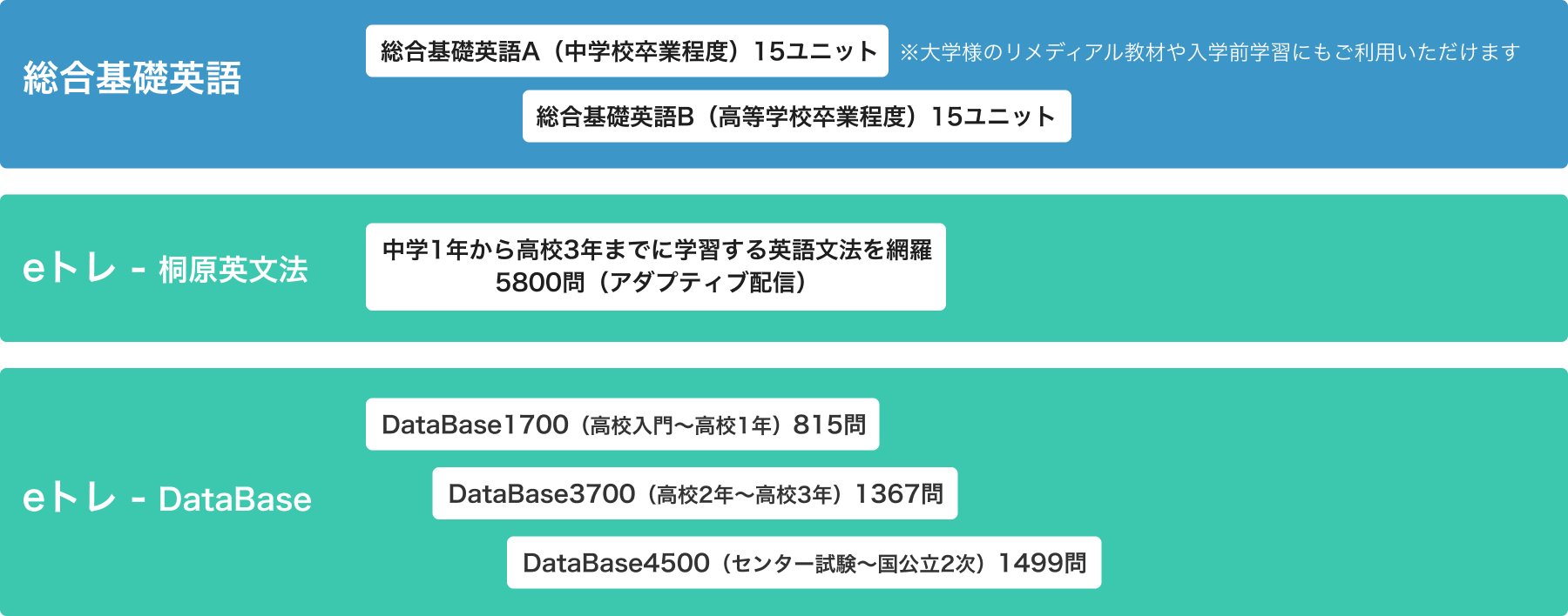 総合基礎英語とeトレは、入学前学習やリメディアル教育用の教材となっております。