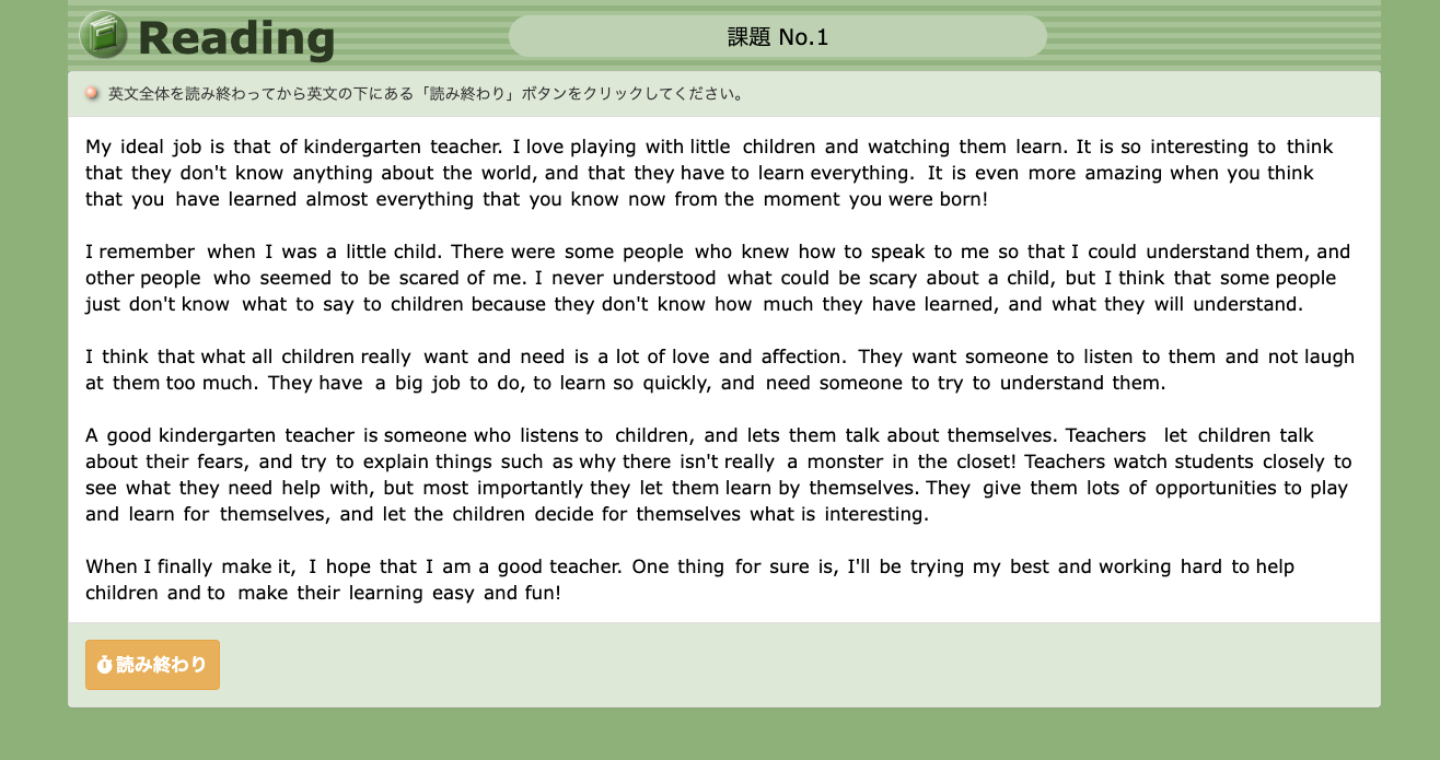 英文のストーリーを読んで、英語で書かれた10問程度の設問に解答をします。1つの英文の長さは300ワードから400ワードです。オーソドックスなスタイルですが、様々なリーディング学習方式の効果を我々なりに調査検討した結果、このオーソドックスな方式が学習者の集中力の点からも効率のよいことがわかり採用しています。リーディングの中にあった単語はボキャブラリでも学習することもできます。