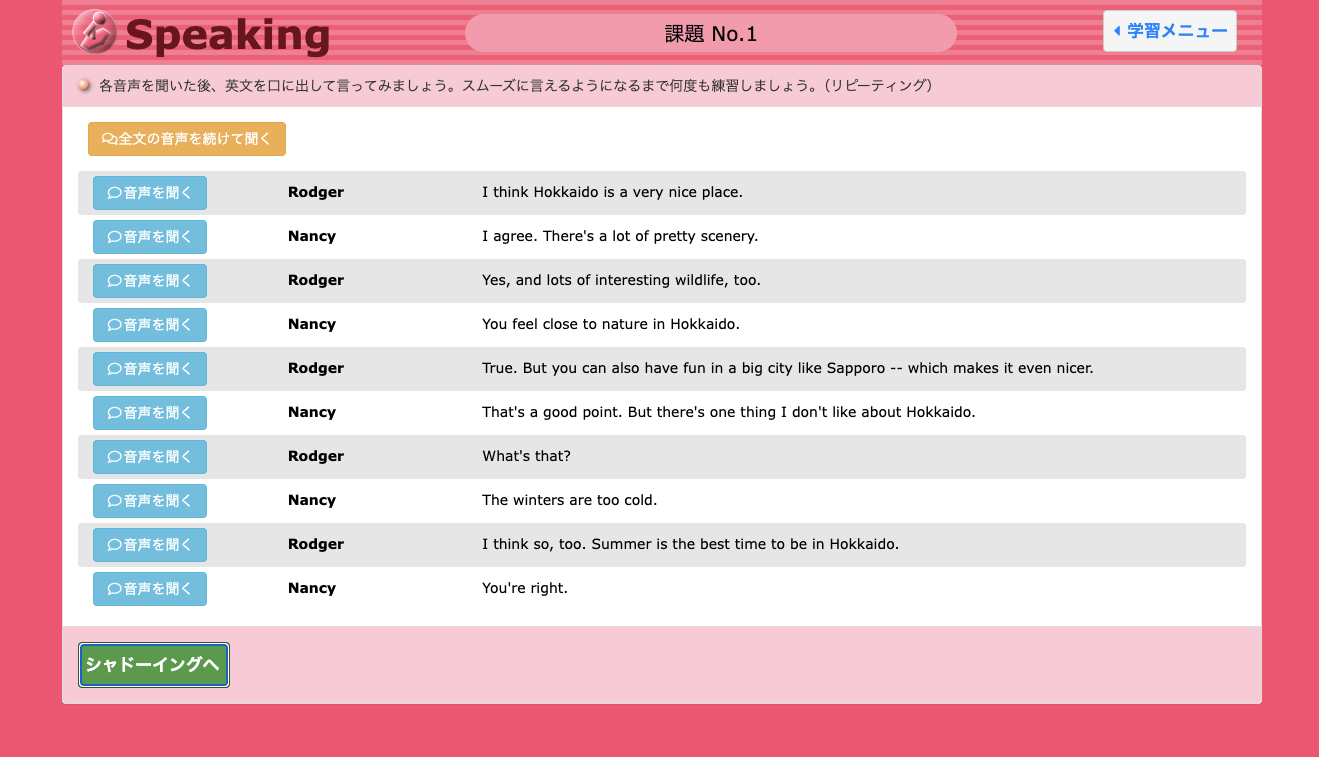 依頼する、あるいは謝罪するといったテーマを含んでおり、リピーティング、シャドウイング、リード&ルックアップ、リテンションなど8パターンの学習方式で徹底的にインプットしていきます。