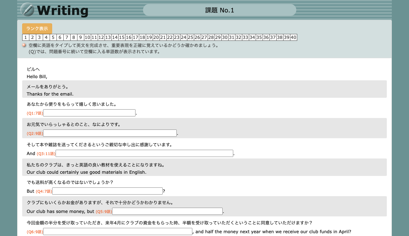 スピーキングと同様に、ライティングでもコミュニケーションを取るため最低限の基本英文を覚える必要があり、このライティング教材は、大量の手紙(メール)形式の英文を学習することでライティング力の元となる英文を記憶するというものになっています。